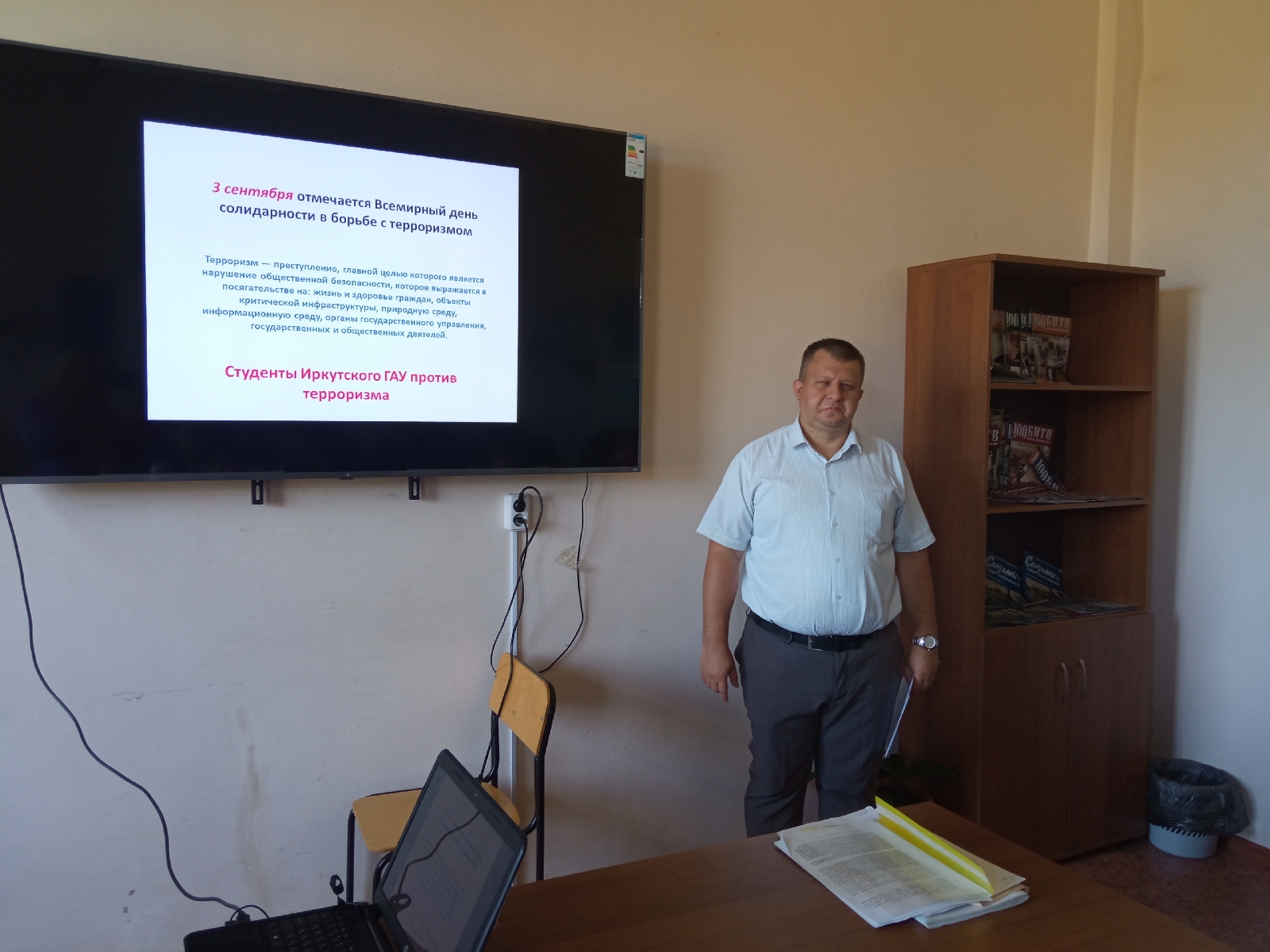 Доцент кафедры философии, социологии и истории Иванов В.В. рассказал студентам об истории терроризма в России и в мире, а также об актуальных проблемах и решениях антитеррористической деятельности федеральной службы безопасности России. Во время беседы подробно освятили трагедию в Беслане, которой в этом году исполняется 21 год, а также была подчеркнута необходимость не забывать о ней, ведь в результате этого теракта погибли ни в чем неповинные дети. Также было обращено на тот факт, что украинские спецслужбы при поддержке западных кураторов летом 2025 г. осуществили теракт на авиабазе Белая, расположенной недалеко от поселка Средний в Иркутской области. Особое внимание было обращено на осознание студентами недопустимости поддаваться на провокации всевозможных украинских «агитаторов» для участия в террористических актах