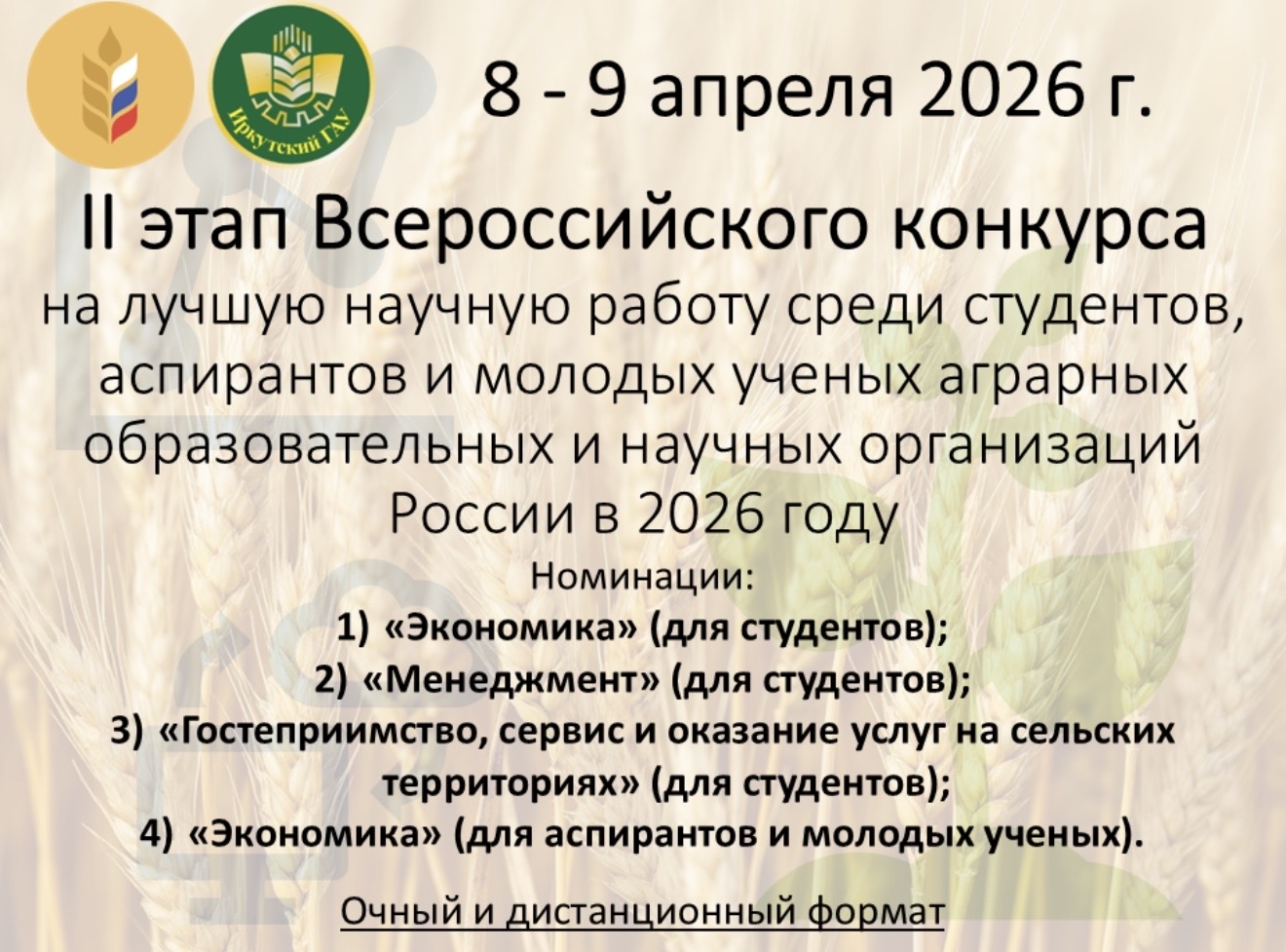 8 – 9 апреля 2026 г. на базе Иркутского ГАУ проведён II этапа Конкурса по следующим номинациям: