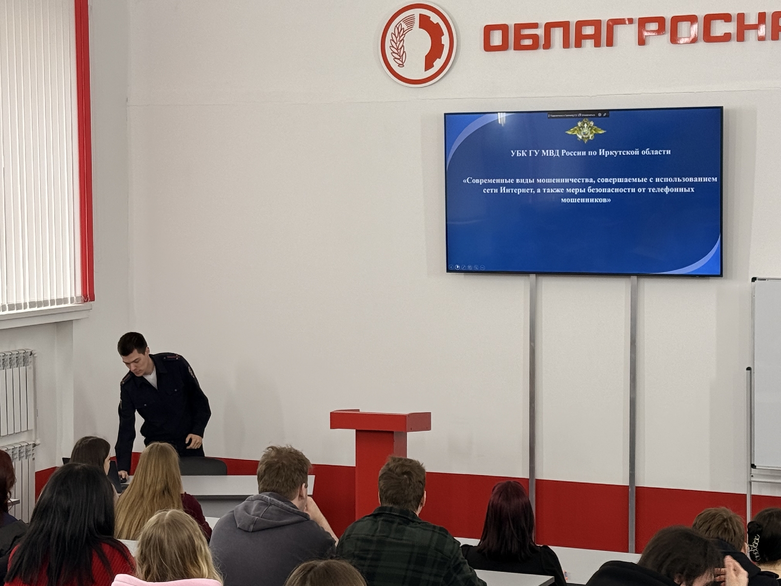 Оперуполномоченный УБК ГУ МВД России по Иркутской области лейтенант полиции Константин Лоскутников рассказал 60 студентам Иркутского ГАУ о наиболее популярных видах преступлений, совершаемых с использованием IT- технологий. Особое внимание спикер уделил трем схемам мошенников, входящим в топ: