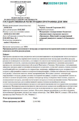 Свидетельство о государственной регистрации программы для ЭВМ № 2025612610 Российская Федерация. Программа расчета одношнекового экструдера для производства парниковой пленки из полимерного композита способом раздува рукава : заявл. 28.01.2025 : опубл. 03.02.2025 / А. Г. Черных ; заявитель Федеральное государственное бюджетное образовательное учреждение высшего образования «Иркутский государственный аграрный университет имени А.А.Ежевского». – EDN AHZZUN.