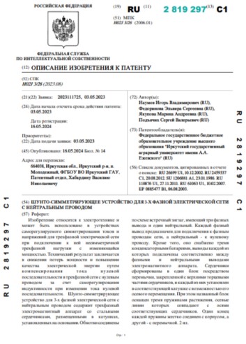 Патент № 2819297 C1 Российская Федерация, МПК H02J 3/26. шунто-симметрирующее устройство для 3-х фазной электрической сети с нейтральным проводом : № 2023111725 : заявл. 03.05.2023 : опубл. 16.05.2024 / И. В. Наумов, Э. С. Федоринова, М. А. Якупова, С. В. Подъячих ; заявитель Федеральное государственное бюджетное образовательное учреждение высшего образования "Иркутский государственный аграрный университет имени А.А. Ежевского". – EDN DCSGAH.